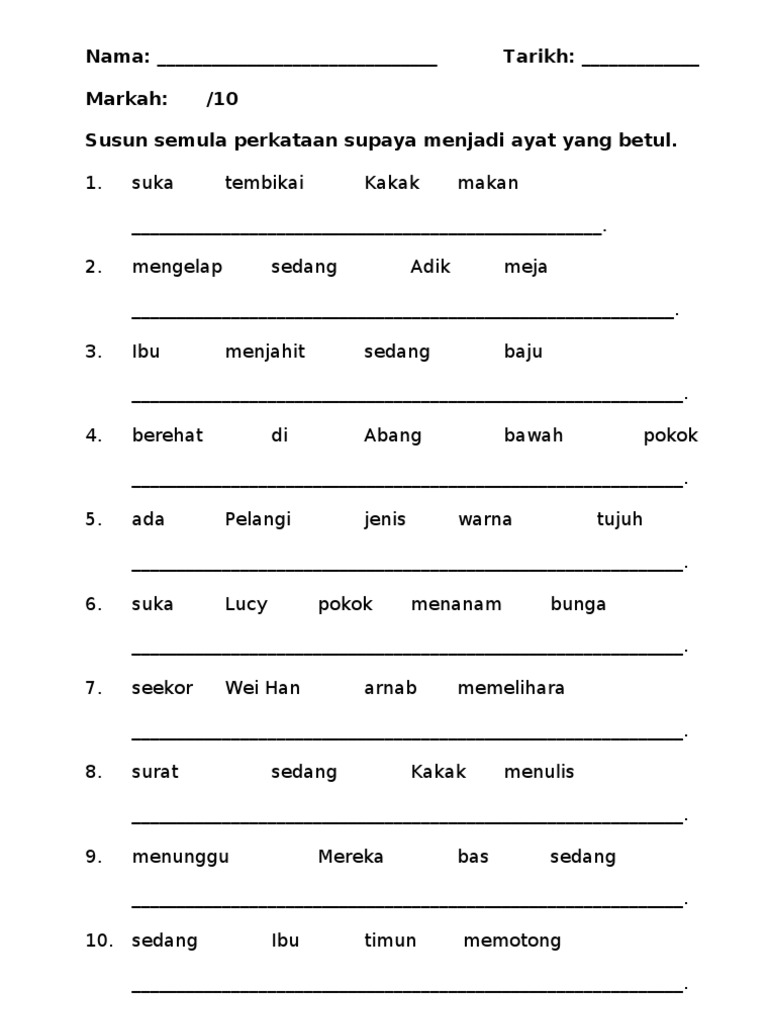 Play this game to review Education. Tahun 1-2 Bahasa Melayu Susun Ayat. Isi kandungan soalan peperiksaan ini adalah berdasarkan Dokumen Penjajaran Kurikulum 20 serta Rancangan Pengajaran Tahunan.